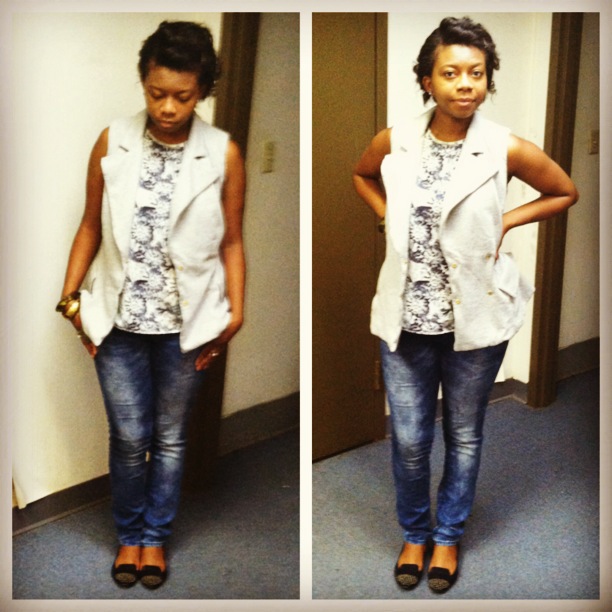 Cotton vest: Rachel Rachel Roy. Floral tank: H&M, Denim & loafers: H&M